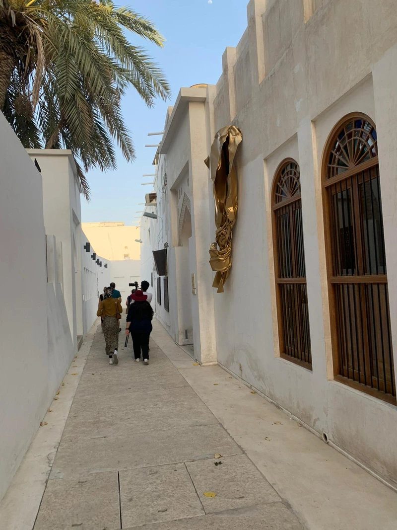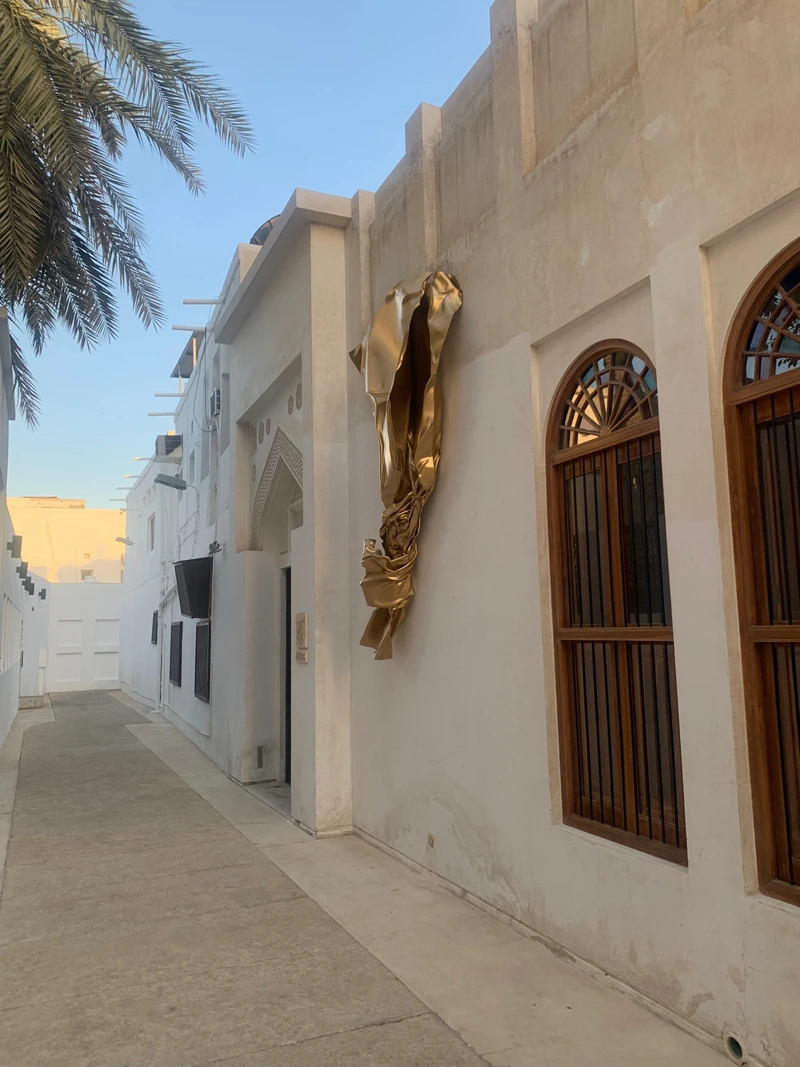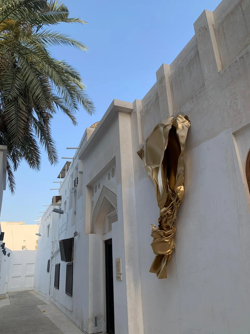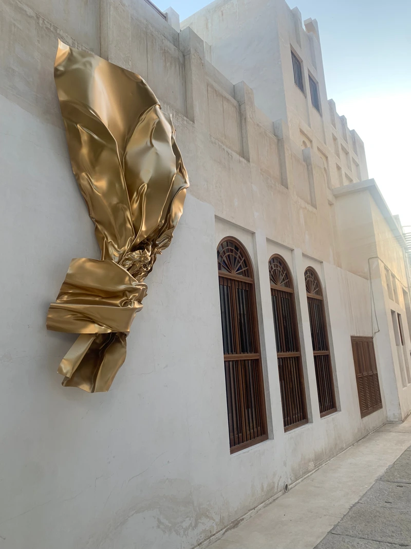 This artwork is the result of a collaboration between the Sheikh Ebrahim Center for Culture and Research, Bahrain Gallery, and the Portuguese artist Miguel Rodrigues. The sculpture represents a contemporary artistic piece inspired by the form of gold leaf, with its radiant golden color, and has been installed on the wall of Bayt Nuzul Qabila, opposite Bayt Al Kurar in the city of Muharraq.