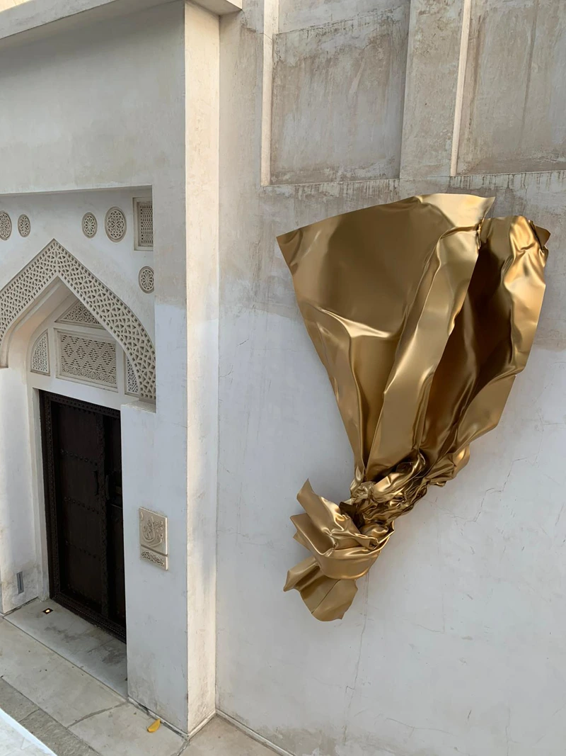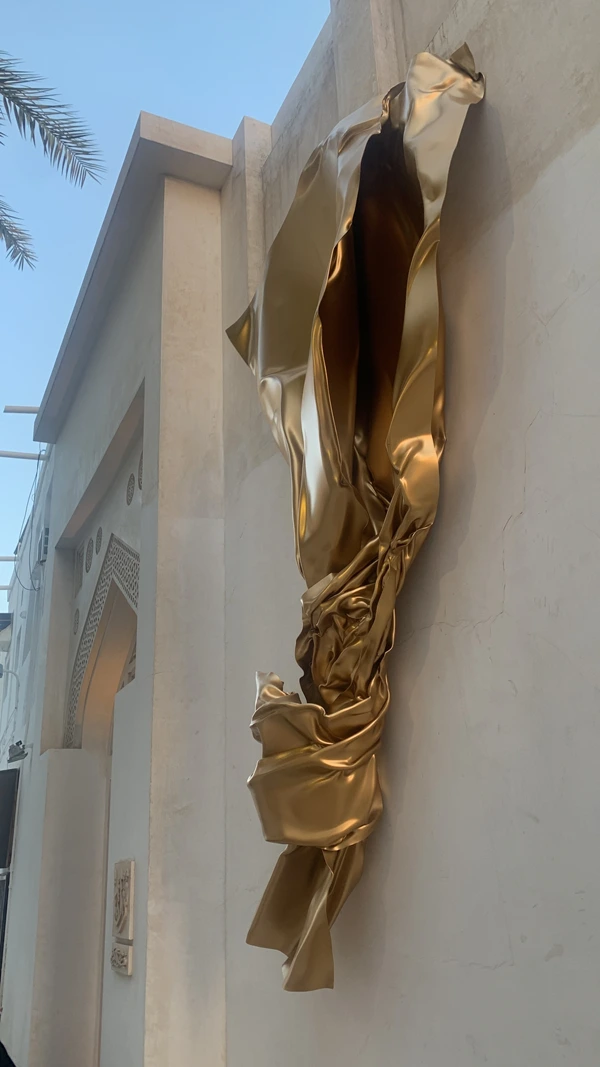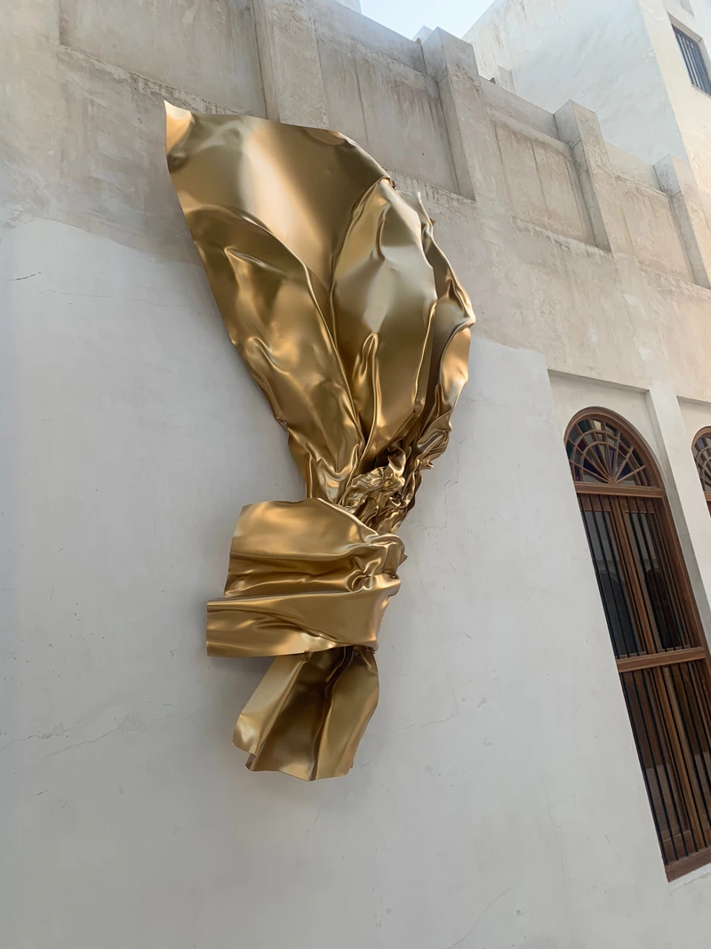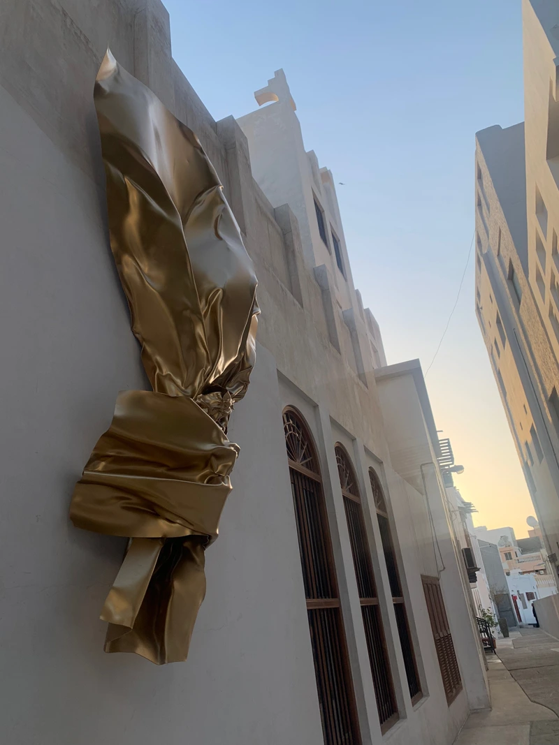 This artwork is the result of a collaboration between the Sheikh Ebrahim Center for Culture and Research, Bahrain Gallery, and the Portuguese artist Miguel Rodrigues. The sculpture represents a contemporary artistic piece inspired by the form of gold leaf, with its radiant golden color, and has been installed on the wall of Bayt Nuzul Qabila, opposite Bayt Al Kurar in the city of Muharraq.