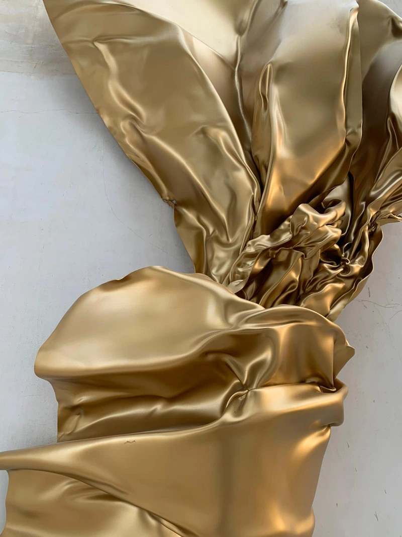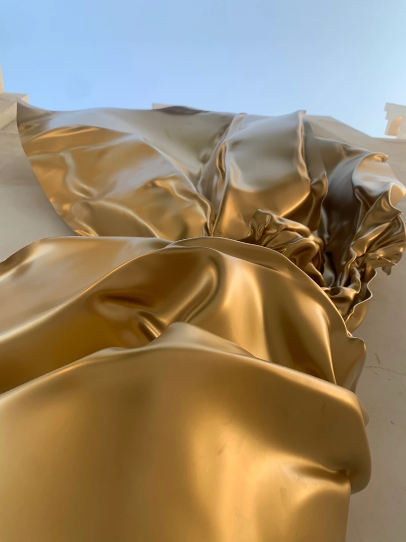 The folds of the golden sculpture give the piece a dynamic visual presence, where the metallic form appears suspended in a continuous moment of transformation between solidity and fluidity. Despite its material rigidity, the surface takes on the appearance of flowing fabric, its folds captured in a fleeting moment in time—creating a striking visual tension between the strength of metal and the softness of form.