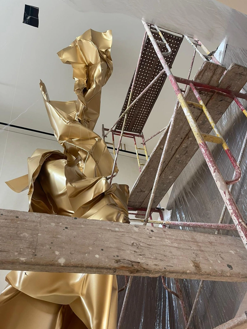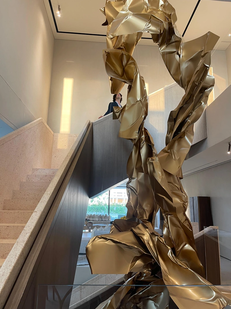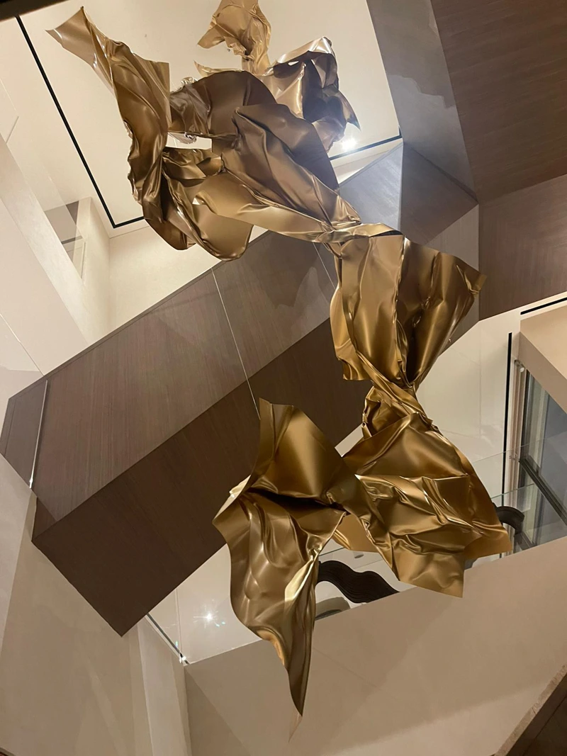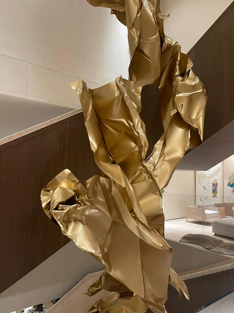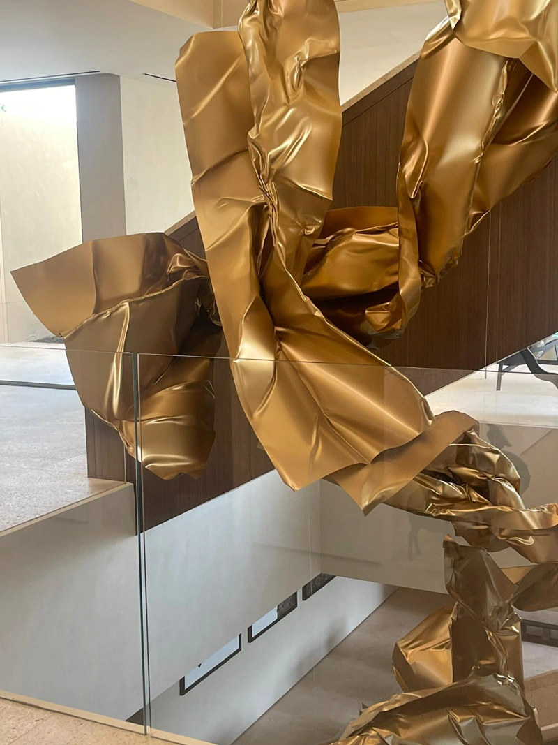 The metallic surfaces resemble flowing fabric frozen in a fleeting moment in time, giving the work a sense of continuous motion despite the rigidity of the material. The golden color enhances the sculpture’s luxurious visual presence, as light reflects across its layered folds, producing shifting luminous effects that add a dynamic dimension to the piece.